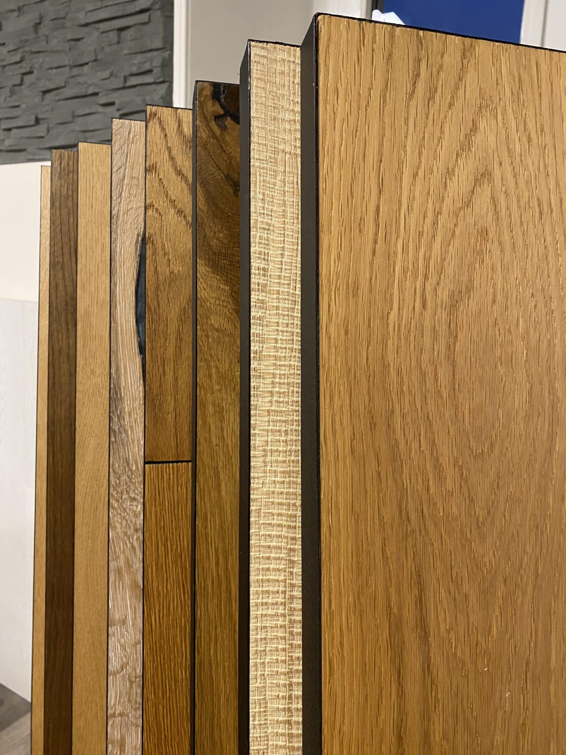 Nous travaillons des épaisseurs adaptées à chaque projet : du massif 12–20 mm jusqu’au contrecollé avec couche d’usure généreuse (4–6 mm), gage de longévité et de ponçages futurs. Le parquet chêne est très demandé pour sa tenue mécanique et sa belle lecture du veinage. Parements, chanfreins, brossages et finitions (huilé ou verni) sont définis avec vous pour obtenir exactement le rendu souhaité.